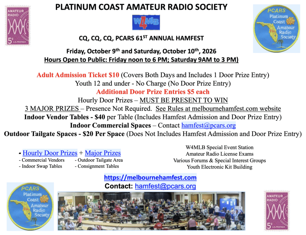 Postal address: PCARS Hamfest, PO Box 1004, Melbourne, FL 32902-1004